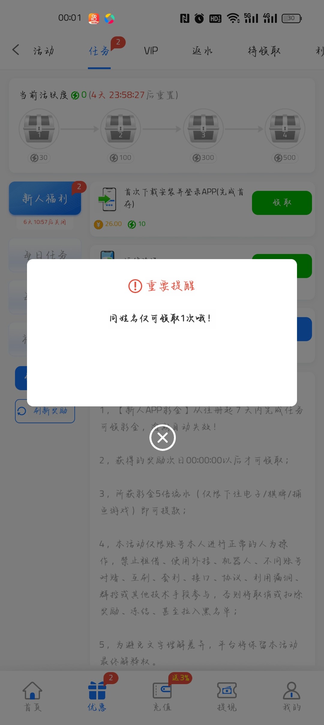 tm的老子第一次注册,有充10送28的活动,我等了一天,居然告诉我同姓名,我真的是服了,活动规则里也没有明确表明同姓名或同ip,直接曝光,想参加的去派出所改名字去,改个独一无二的再去参与
