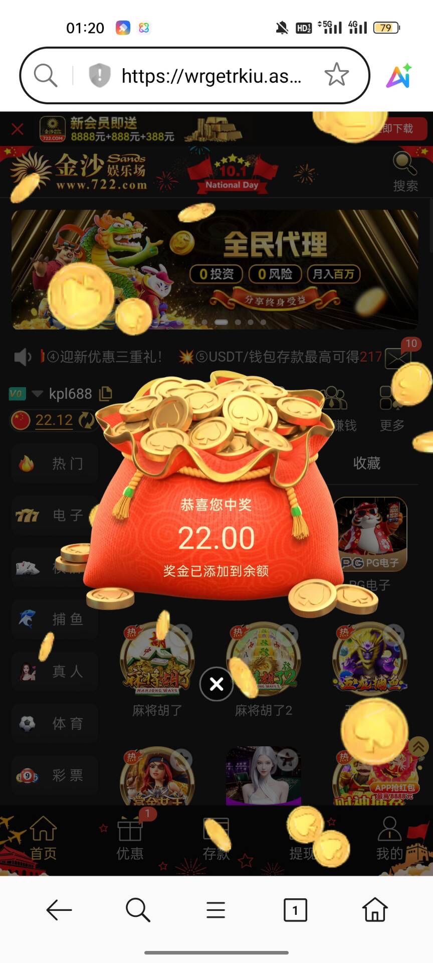 之前是特邀,那个没打出来,国庆这个22彩金也送了,打到220了,不知道什么时候到账