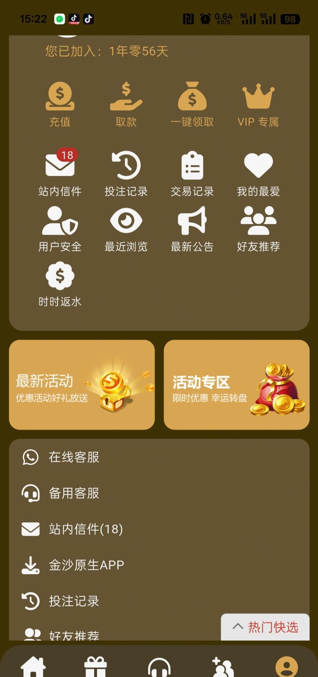 链接5325.com 注册账号有一年多了,未充值游戏过,接到回访电话,说注册账号送88元彩金,连送3天,后面注册提示手机号码已经注册了,于是登陆了一年前注册的账号,专员说可以参加充值30送58 充值50送88彩金,充值50后联系在线客服领取88彩金,客服打死都说没有这个活动,只给了8元神秘彩金,硬要没用,只能游戏投注,捕鱼输了,打码超过500流水,成功晋级,今天收到晋级3彩金和下载APP25彩金(APP彩金需要升级)