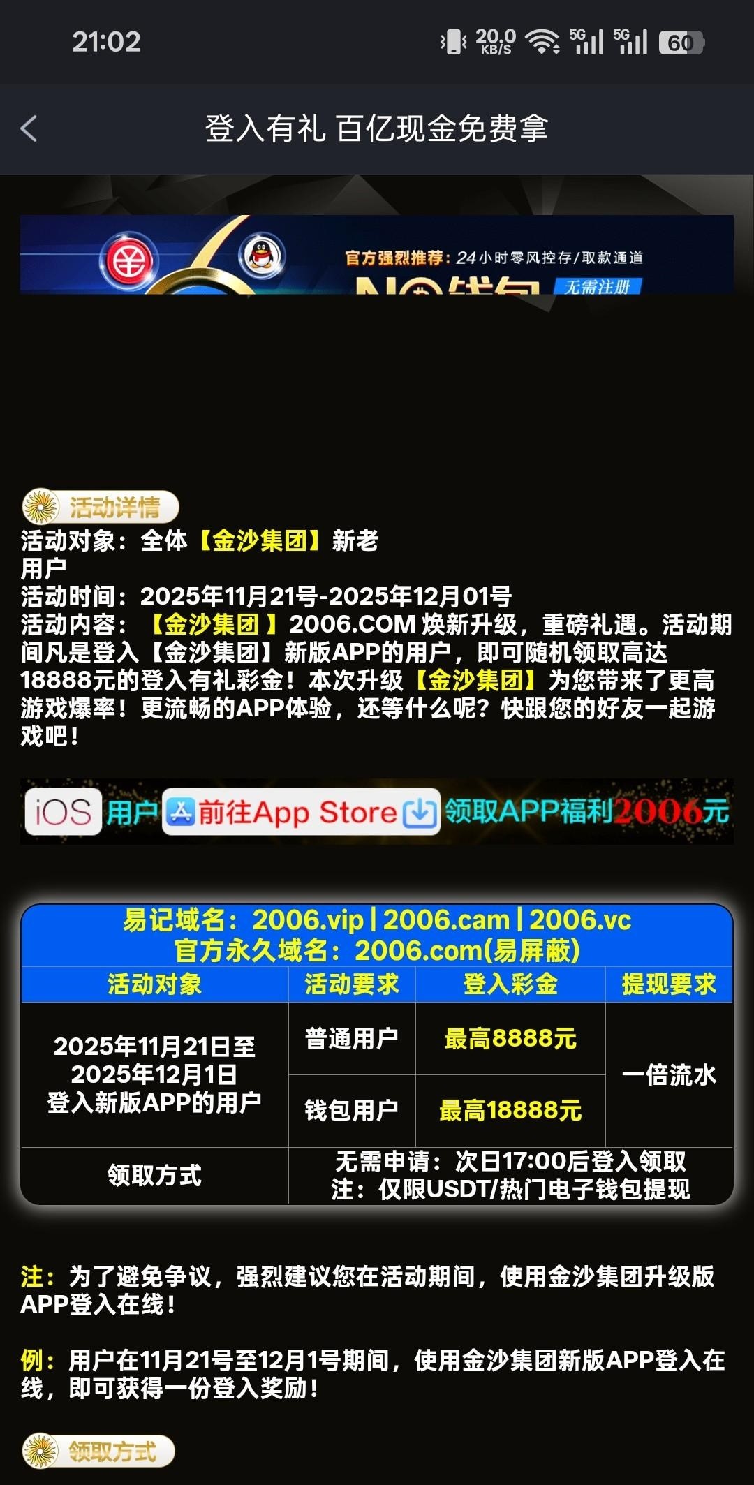 平台活动更新可以领取电话彩金了,我老用户也领到了,链接2006.com,明天登录也还有2个活动,一个是保存网址送彩金一个登录app彩金