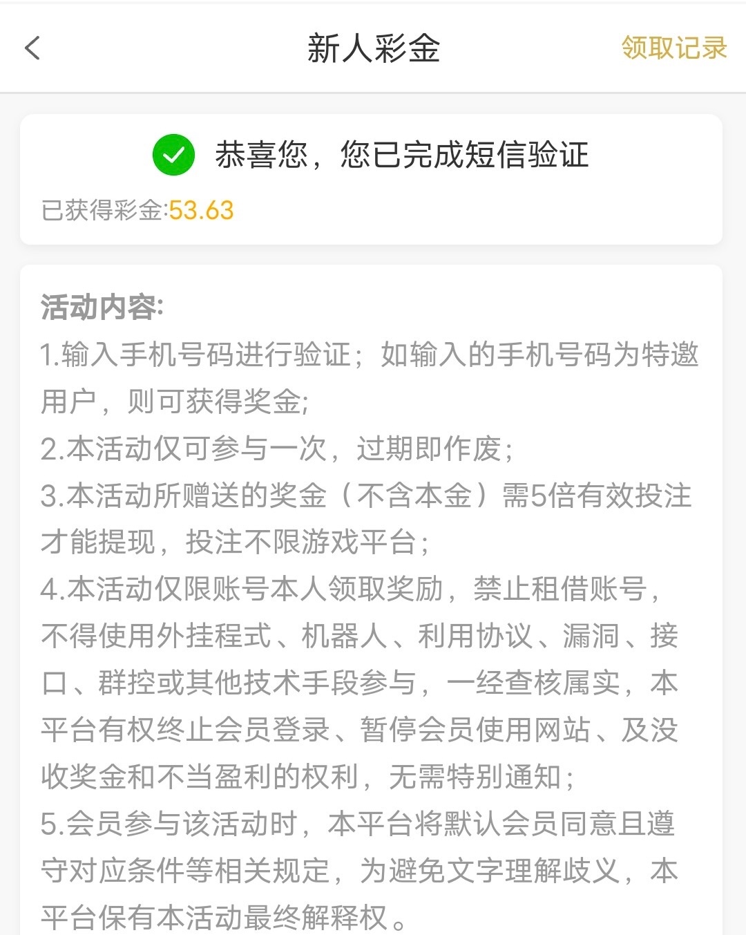 新用户注册特邀短信号码验证自助领取9-88彩金,游戏要10才能进,具体自测吧