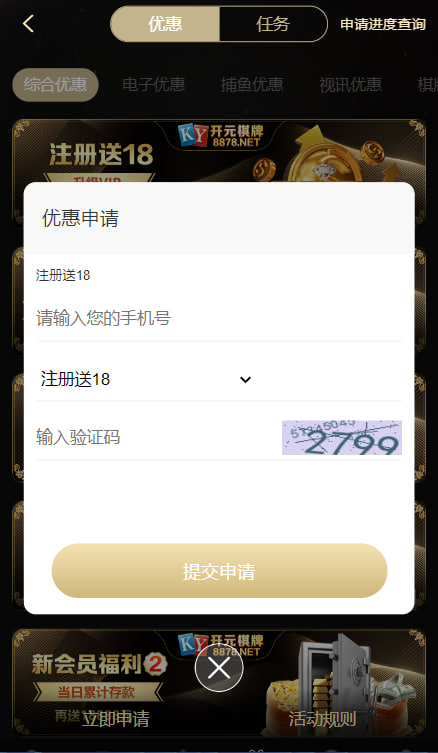 新人注册绑定手机号码,银行卡,选择优惠页面申请注册送18